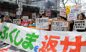 上圖:3月11日,日本東京民眾舉行抗議核電集會(huì)。新華社記者 馬平/攝