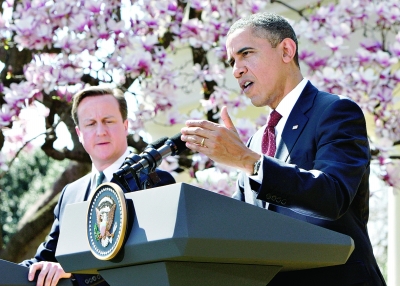 圖為奧巴馬(右)與卡梅倫在聯(lián)合記者會(huì)上發(fā)表講話(huà)。