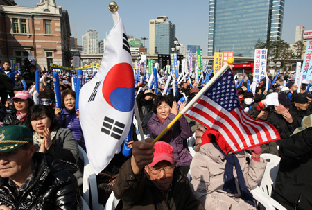 3月15日,韓國和美國自由貿易協(xié)定(FTA)正式生效,韓美兩國將分階段廢除所有商品關稅。韓國民眾對此事反應不一,圖為部分民眾在首爾舉行慶祝集會。