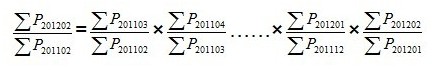 3、同比價(jià)格指數(shù)的計(jì)算方法。由于部分城市用以計(jì)算同比價(jià)格指數(shù)的基期網(wǎng)簽數(shù)據(jù)缺失,故不能計(jì)算2012年10月前各月與網(wǎng)簽數(shù)據(jù)同一口徑的同比價(jià)格指數(shù)。為保持同比價(jià)格指數(shù)計(jì)算和發(fā)布的連續(xù)性和穩(wěn)定性,滿足有關(guān)方面的需要,國(guó)家統(tǒng)計(jì)局采用有關(guān)房?jī)r(jià)統(tǒng)計(jì)數(shù)據(jù)和按網(wǎng)簽數(shù)據(jù)計(jì)算的房?jī)r(jià)數(shù)據(jù),根據(jù)同比指數(shù)和環(huán)比指數(shù)之間的數(shù)學(xué)關(guān)系,對(duì)2月份同比價(jià)格指數(shù)的計(jì)算進(jìn)行了技術(shù)處理:將2011年3—12月的環(huán)比數(shù)據(jù)連乘再乘以今年1—2月的環(huán)比數(shù)據(jù)生成本月同比價(jià)格指數(shù)。以此類推可計(jì)算其他月份的同比價(jià)格指數(shù)。計(jì)算公式表示為: