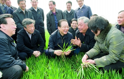 這是3月17日,在臨潁縣固廂鄉(xiāng)小師村,溫家寶走進(jìn)麥田深處察看土地墑情和小麥蘗株情況。