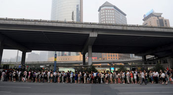 圖為一些北京CBD的上班族下班后在國貿(mào)橋下排隊等候回家的公共汽車。記者 羅曉光