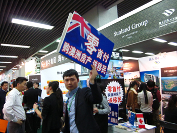 4月5日,為期四天的2012年北京春季房地產(chǎn)展示交易會(huì)在中國(guó)國(guó)際貿(mào)易中心開(kāi)幕。本屆房展會(huì)有美國(guó)、加拿大、澳大利亞、新加坡、英國(guó)、泰國(guó)等超過(guò)30個(gè)國(guó)家和地區(qū)的130多個(gè)海外地產(chǎn)商參加。數(shù)百個(gè)項(xiàng)目類(lèi)型涵蓋了住宅、公寓、別墅、土地交易和投資移民等。圖為一家澳洲房產(chǎn)展臺(tái)工作人員打出“零首付、送移民”的廣告牌吸引看房客。記者