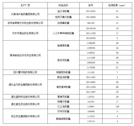 第一批檢驗(yàn)主要針對(duì)媒體曝光的9家藥品生產(chǎn)企業(yè),共抽驗(yàn)33個(gè)品種42個(gè)批次,其中23個(gè)批次不合格。檢驗(yàn)結(jié)果表明,長春海外制藥集團(tuán)有限公司、青海格拉丹東藥業(yè)有限公司、丹東市通遠(yuǎn)藥業(yè)有限公司、吉林省輝南天宇藥業(yè)股份有限公司、四川蜀中制藥有限公司、修正藥業(yè)集團(tuán)股份有限公司、通化金馬藥業(yè)集團(tuán)股份有限公司、通化盛和藥業(yè)股份有限公司、通化頤生藥業(yè)股份有限公司等企業(yè)有的批次產(chǎn)品使用的膠囊鉻含量超過國家藥典限量標(biāo)準(zhǔn)。上述企業(yè)未按藥品生產(chǎn)質(zhì)量管理規(guī)范組織生產(chǎn),使用了不符合國家藥典標(biāo)準(zhǔn)的膠囊,產(chǎn)品質(zhì)量不合格。