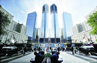 4月30日,人們從正在建設(shè)的紐約世貿(mào)中心1號樓(中右)下經(jīng)過,旁邊高樓的玻璃幕墻反映出世貿(mào)中心1號樓的影像(中左)。 當(dāng)天,紐約世貿(mào)中心1號樓已建設(shè)到第100層,高度達(dá)到1271英尺(約合387.4米),超過了帝國大廈在安裝天線前的381米,成為紐約第一高樓。紐約世貿(mào)中心1號樓設(shè)計(jì)高度為1776英尺(約合541米),預(yù)計(jì)將于2013年竣工。