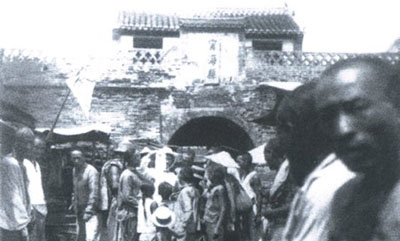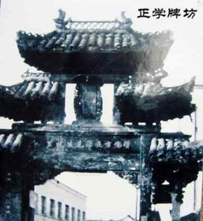上個(gè)世紀(jì)60年代的寧?h城街道。圖中牌坊為紀(jì)念明代大儒方孝孺而建的正學(xué)牌坊(毀于文革)。