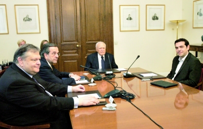 5月13日,希臘總統(tǒng)卡羅洛斯·帕普利亞斯(右二)在雅典會見泛希社運領導人埃萬耶洛斯·韋尼澤洛斯(左一)、新民主黨領導人安東尼斯·薩馬拉斯(左二)和左翼激進聯(lián)盟黨領導人亞歷克西斯·齊普拉斯(右一)。 希臘議會第三大政黨泛希臘社會主義運動、即泛希社運12日交還總統(tǒng)帕普利亞斯的授權,放棄組閣嘗試。帕普利亞斯于13日中午召集所有政黨領導人,以求就組閣達成一致。據(jù)外媒報道,薩馬拉斯稱,左翼激進聯(lián)盟黨反對組建聯(lián)合政府,重新選舉難以避免。新華社發(fā)
