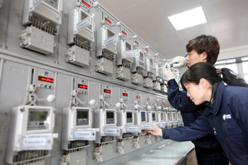 國家電網(wǎng)安徽蚌埠供電公司員工校驗智能電表,為即將試行的居民階梯電價做準備。新華社發(fā)(牛路/攝) |