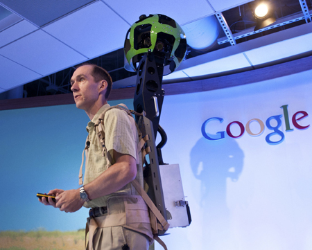 圖為6日在美國(guó)舊金山的谷歌公司的辦公室,谷歌地圖總工程師文森特(Luc Vincent)背著Street View Trekker的場(chǎng)景。