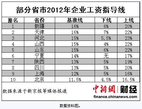 中新網(wǎng)財(cái)經(jīng)頻道統(tǒng)計(jì)發(fā)現(xiàn),截至6月19日,目前全國(guó)已有10個(gè)省份發(fā)布了2012年的企業(yè)工資指導(dǎo)線。其基準(zhǔn)線大多在14%左右,其中新疆和天津基準(zhǔn)線最高,達(dá)16%,北京基準(zhǔn)線最低,為11.5%。