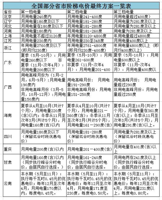中新網能源頻道了解到,在已公布階梯電價最終實施方案的北京、遼寧、河北、河南、江蘇、上海、浙江、廣東、廣西,海南、云南、四川、重慶、甘肅等14個省市中,對“一戶一表”抄表到戶,用戶執(zhí)行階梯電價,電價均分三檔。