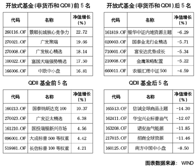 從具體基金產(chǎn)品來看,在普通股票型基金中,景順長(zhǎng)城核心競(jìng)爭(zhēng)力(22.72%)、廣發(fā)聚瑞(19.66%)、廣發(fā)核心精選(18.14%)業(yè)績(jī)位居前三;在指數(shù)型基金中國(guó)投瑞銀滬深300金融(9.87%)、富國(guó)中證500(9.66%)、博時(shí)超大盤ETF(9.04%)位居前三;混合型基金中富國(guó)天瑞強(qiáng)勢(shì)精選(17.50%)、中銀收益(15.65%)、交銀主題優(yōu)選(12.98%)表現(xiàn)最好;萬家添利分級(jí)(13.77%)、天治穩(wěn)健雙盈(12.96%)、南方廣利回報(bào)AB(10.96%)位居全部債券型基金業(yè)績(jī)前三。