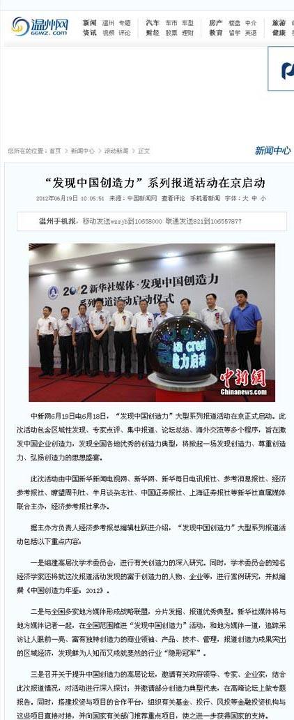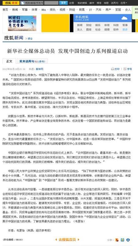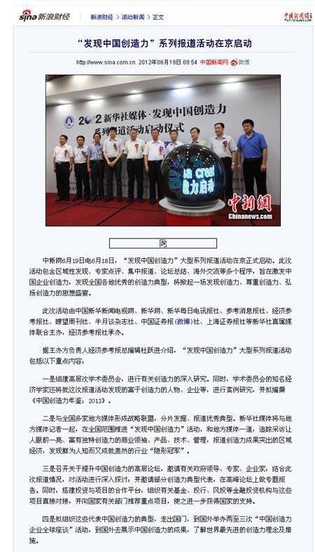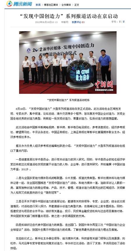 “發(fā)現(xiàn)中國創(chuàng)造力”系列報道活動已于6月18日在北京正式啟動,各大門戶網(wǎng)站及地方網(wǎng)站紛紛進(jìn)行報道。