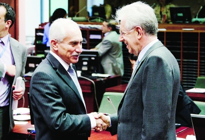 圖為意大利總理(兼任財(cái)長(zhǎng))馬里奧·蒙蒂(右)與塞浦路斯財(cái)長(zhǎng)希亞爾利在會(huì)場(chǎng)握手交談。