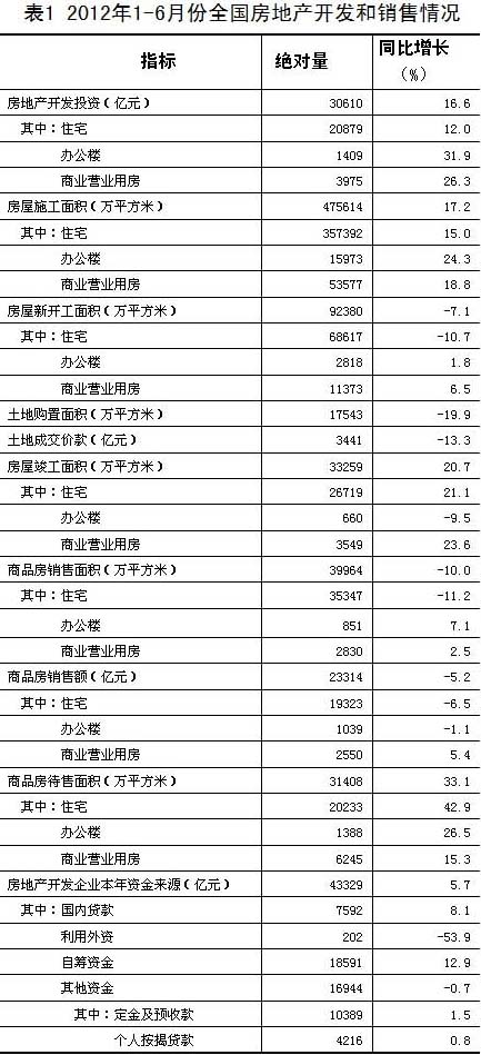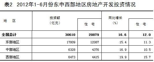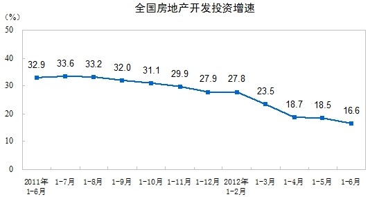 2012年1-6月份,全國(guó)房地產(chǎn)開(kāi)發(fā)投資30610億元,同比名義增長(zhǎng)16.6%(扣除價(jià)格因素實(shí)際增長(zhǎng)14.3%),增速比1-5月份回落1.9個(gè)百分點(diǎn)。其中,住宅投資20879億元,增長(zhǎng)12.0%,增速回落1.6個(gè)百分點(diǎn),占房地產(chǎn)開(kāi)發(fā)投資的比重為68.2%。