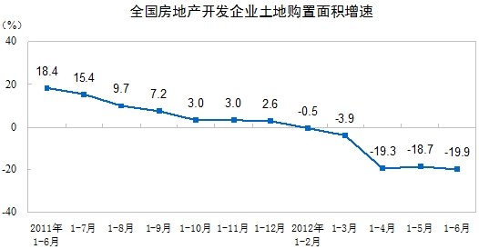1-6月份,房地產(chǎn)開(kāi)發(fā)企業(yè)土地購(gòu)置面積17543萬(wàn)平方米,同比下降19.9%,降幅比1-5月份擴(kuò)大1.2個(gè)百分點(diǎn);土地成交價(jià)款3441億元,下降13.3%,降幅擴(kuò)大3.3個(gè)百分點(diǎn)。