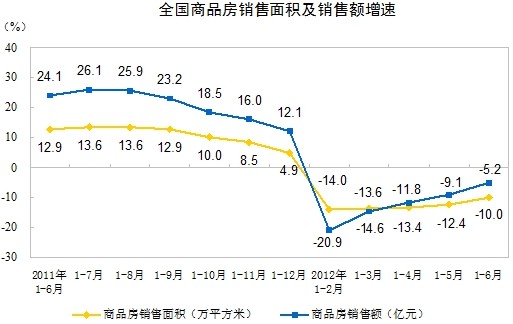 1-6月份,商品房銷(xiāo)售面積39964萬(wàn)平方米,同比下降10.0%,降幅比1-5月份縮小2.4個(gè)百分點(diǎn);其中,住宅銷(xiāo)售面積下降11.2%,辦公樓銷(xiāo)售面積增長(zhǎng)7.1%,商業(yè)營(yíng)業(yè)用房銷(xiāo)售面積增長(zhǎng)2.5%。商品房銷(xiāo)售額23314億元,下降5.2%,降幅縮小3.9個(gè)百分點(diǎn);其中,住宅銷(xiāo)售額下降6.5%,辦公樓銷(xiāo)售額下降1.1%,商業(yè)營(yíng)業(yè)用房銷(xiāo)售額增長(zhǎng)5.4%。