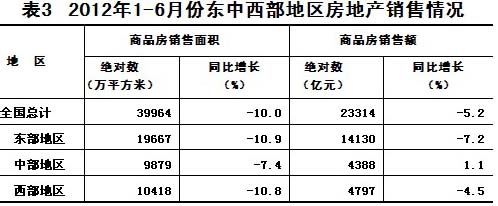 1-6月份,東部地區(qū)商品房銷(xiāo)售面積19667萬(wàn)平方米,同比下降10.9%,降幅比1-5月份縮小3.2個(gè)百分點(diǎn);銷(xiāo)售額14130億元,下降7.2%,降幅縮小4.9個(gè)百分點(diǎn)。中部地區(qū)商品房銷(xiāo)售面積9879萬(wàn)平方米,下降7.4%,降幅縮小2.8個(gè)百分點(diǎn);銷(xiāo)售額4388億元,增長(zhǎng)1.1%,1-5月份為下降2.9%。西部地區(qū)商品房銷(xiāo)售面積10418萬(wàn)平方米,下降10.8%,降幅縮小0.3個(gè)百分點(diǎn);銷(xiāo)售額4797億元,下降4.5%,降幅縮小0.5個(gè)百分點(diǎn)。