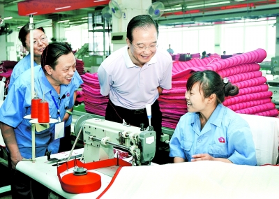 7月13日至15日,中共中央政治局常委、國(guó)務(wù)院總理溫家寶到四川省成都市就當(dāng)前經(jīng)濟(jì)形勢(shì)進(jìn)行調(diào)研,并在成都主持召開(kāi)河南、湖南、廣西、四川、陜西五省區(qū)經(jīng)濟(jì)形勢(shì)座談會(huì)。這是7月14日,溫家寶在彩虹電器集團(tuán)公司生產(chǎn)車間與工人交談。
