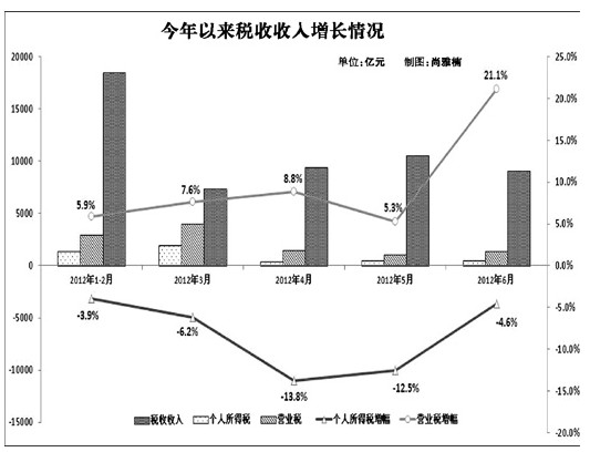 財政部公布的最新數據顯示:今年上半年,全國稅收收入為54932億元,同比增長9.8%,增幅同比大幅回落19.8個百分點。
