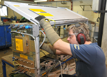 庫薩科斯基公司黑諾拉回收處理廠預處理車間的工人在拆卸廢棄的電子設備。 |