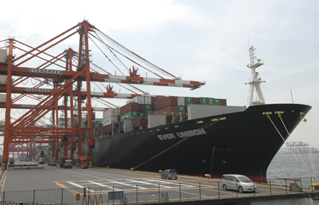 7月25日,一艘貨輪?吭谌毡緰|京大井集裝箱碼頭。 日本財(cái)務(wù)省25日公布的速報(bào)數(shù)據(jù)顯示,今年上半年日本出現(xiàn)2.9158萬億日元(約合373億美元)貿(mào)易逆差,創(chuàng)有統(tǒng)計(jì)以來半年期貿(mào)易逆差新高。