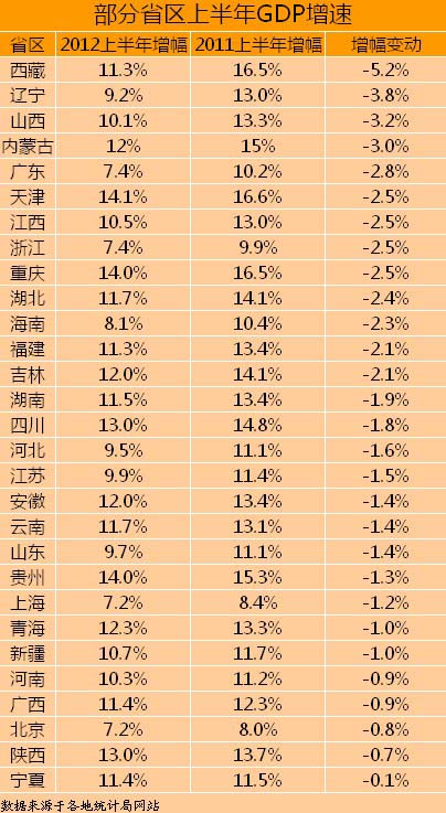 截至8月1日,除甘肅和黑龍江省之外,全國(guó)已有29個(gè)省(自治區(qū)、直轄市)份公布了2012年上半年GDP(國(guó)內(nèi)生產(chǎn)總值)增速。與2011年上半年相比,29個(gè)省份的GDP增速均出現(xiàn)了放緩。其中,西藏增幅下降最大,降幅達(dá)5.2個(gè)百分點(diǎn)。