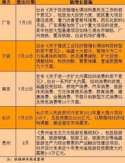 除了中央投資力度不斷增長外,各地也陸續(xù)出臺各種政策,增加投資規(guī)模。中新網(wǎng)財經(jīng)頻道統(tǒng)計發(fā)現(xiàn),7月以來,廣東、寧波、南京、長沙、貴州等多個省市出臺穩(wěn)增長若干措施,拉開地方穩(wěn)增長大幕。