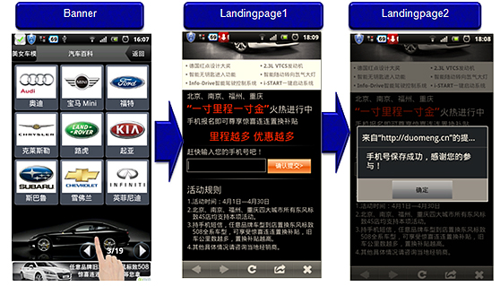 作為中國第一智能手機(jī)廣告平臺的多盟(domob)能夠針對人群定向營銷,做到精準(zhǔn)無線營銷。多盟通過LBS技術(shù)進(jìn)行精準(zhǔn)投放,能夠為定向人群提供新車上市,促銷活動等信息,也可以招募用戶進(jìn)行試駕,同時能夠幫助用戶找到距離最近的4S店,提供更貼心,更細(xì)致的服務(wù)。
