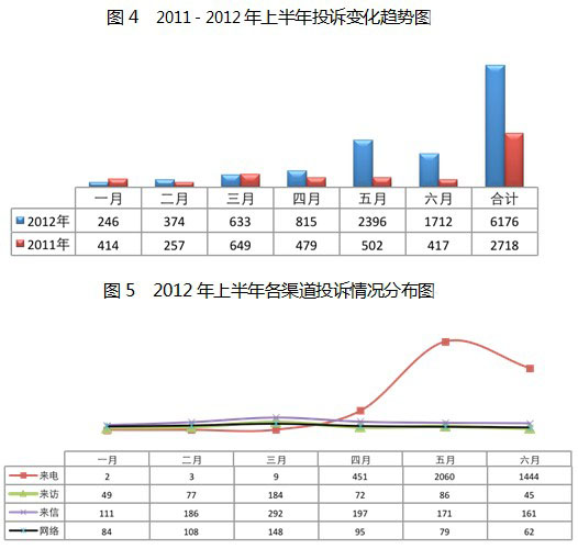 2012年上半年,保監(jiān)會(huì)共接收保險(xiǎn)消費(fèi)者有效投訴件6176件,同比增長(zhǎng)127.23%,增長(zhǎng)態(tài)勢(shì)明顯。主要是12378熱線開(kāi)通后投訴渠道更加暢通,熱線的投訴量占今年上半年投訴總量的69.01%。從各投訴渠道來(lái)看,信件、網(wǎng)絡(luò)、來(lái)訪接收的投訴總量均呈現(xiàn)下降態(tài)勢(shì),下降幅度分別為8.51%、25.58%和18.18%,而電話(huà)投訴3969件,占投訴總量的64.26%,與去年同期相比增加3874件,其中12378熱線接收的投訴達(dá)3941件。