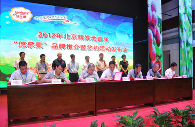 2012年8月28日上午,首屆“北京悠樂果品牌推介會”在北京新發(fā)地農(nóng)產(chǎn)品批發(fā)市場會展中心舉行。圖為“悠樂果”品牌所有人北京旺達玉柱果品有限公司總經(jīng)理徐柱(前排右四)與經(jīng)銷商簽約儀式。