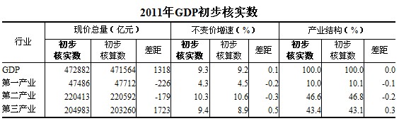 根據(jù)國(guó)家統(tǒng)計(jì)局《關(guān)于印發(fā)<關(guān)于我國(guó)GDP核算和數(shù)據(jù)發(fā)布制度的改革>的通知》(國(guó)統(tǒng)字[2003]70號(hào))的規(guī)定,年度國(guó)內(nèi)生產(chǎn)總值核算包括初步核算、初步核實(shí)和最終核實(shí)三個(gè)階段。近日,國(guó)家統(tǒng)計(jì)局根據(jù)2011年統(tǒng)計(jì)年報(bào)資料、部分行業(yè)財(cái)務(wù)資料和抽樣調(diào)查資料,對(duì)2011年國(guó)內(nèi)生產(chǎn)總值進(jìn)行了初步核實(shí),主要結(jié)果如下: