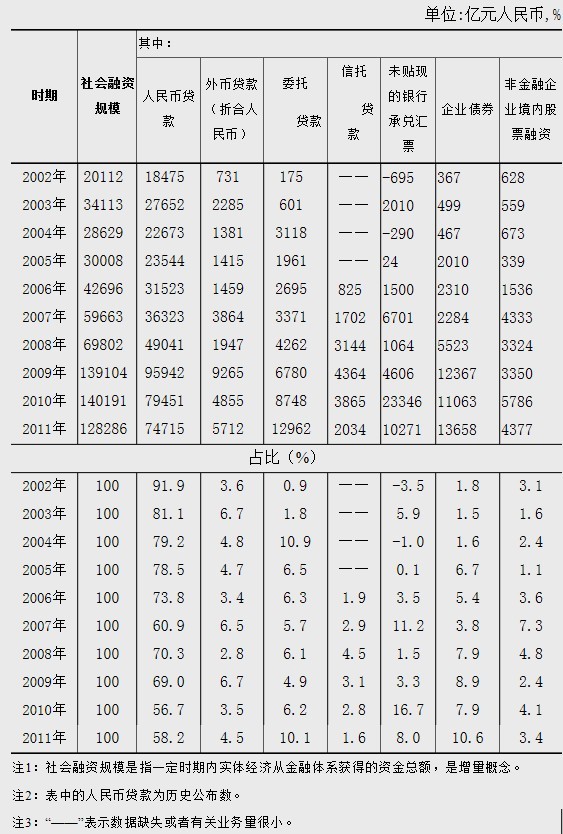 金融結構呈現多元發(fā)展,金融對資源配置的積極作用不斷提高。一是人民幣貸款占比顯著下降,人民幣貸款外的其他方式融資數量和占比明顯上升。2011年新增人民幣貸款7.47萬億元,是2002年的4.04倍;除人民幣貸款外的其他方式融資為5.36萬億元,是2002年的32.7倍,占同期社會融資規(guī)模的41.8%,比2002年上升33.7個百分點。二是直接融資快速發(fā)展,市場配置資金的作用不斷提高。2011年企業(yè)債券和非金融企業(yè)境內股票合計融資1.80萬億元,是2002年的18.1倍;合計占同期社會融資規(guī)模的14.0%,比2002年提高9.1個百分點。三是金融機構表外業(yè)務融資功能顯著增強。2011年實體經濟通過未貼現的銀行承兌匯票、委托貸款和信托貸款從金融體系融資合計達2.53萬億元,而在2002年這些金融工具的融資量還非常小。四是非銀行金融機構對實體經濟的支持力度迅速加大。2011年小額貸款公司新增貸款1934億元,比2009年增長1.5倍,相當于一家中型股份制商業(yè)銀行一年的新增貸款規(guī)模。