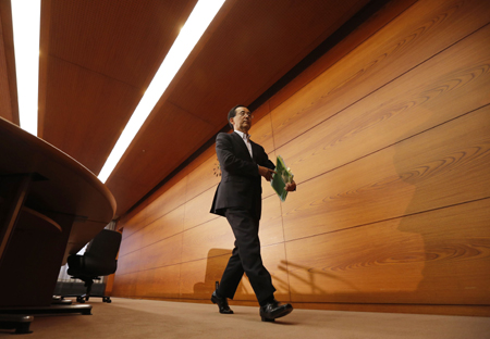 圖為日本央行行長白川方明當(dāng)日在新聞發(fā)布會結(jié)束后離開會場。