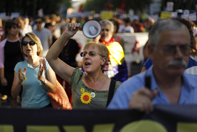 由于西班牙陷入經(jīng)濟(jì)衰退,西班牙政府正面對(duì)越來(lái)越多的街頭抗議,9月22日,在西班牙首都馬德里,民眾抗議西班牙政府的經(jīng)濟(jì)緊縮措施。一些示威者還舉著“無(wú)工作,無(wú)房子,無(wú)畏懼”的標(biāo)語(yǔ)參加游行。西班牙政府表示,將對(duì)整個(gè)經(jīng)濟(jì)進(jìn)行綜合權(quán)衡,避免進(jìn)一步削減公共開(kāi)支。