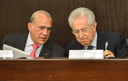 24日,經(jīng)合組織秘書長(zhǎng)葛利亞和意大利總理蒙蒂在羅馬商討意大利的結(jié)構(gòu)改革問題。葛利亞表示,蒙蒂提出的改革必須堅(jiān)持下去,不能走回頭路,這對(duì)歐元區(qū)國(guó)家至關(guān)重要。經(jīng)合組織的一份最新報(bào)告表示,政府的改革將在未來十年給意大利的GDP加上四個(gè)百分點(diǎn)。蒙蒂則樂觀地表示,最近一年進(jìn)行改革后的意大利,不再威脅歐元區(qū)穩(wěn)定。