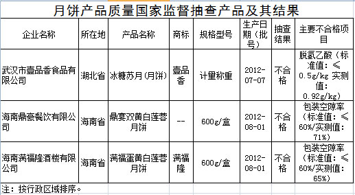 國家質(zhì)檢總局今日在其官網(wǎng)公布了2012年月餅產(chǎn)品質(zhì)量國家監(jiān)督抽查結(jié)果。結(jié)果顯示,本次共抽查320種月餅產(chǎn)品,壹品香、滿福隆等3種月餅不符合標準規(guī)定,不合格項目主要涉及脫氫乙酸、包裝空隙率項目。