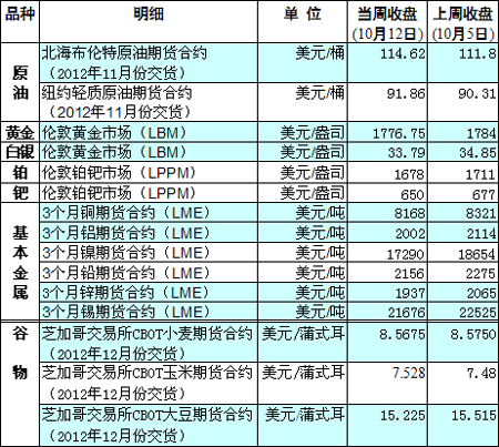 國際大宗商品期貨價格明細(xì)表[2012-10-15]