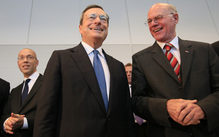歐洲央行行長德拉吉(左)24日在德國議會下院參加聽證會,就歐洲央行無限額購買受困歐元區(qū)國家公債問題發(fā)表講話。德拉吉表示,購買債券計劃不會影響歐洲央行的獨立性,不會帶來額外風險,不會引發(fā)通貨膨脹。