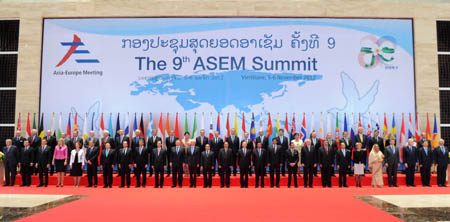 國務(wù)院總理溫家寶5日在老撾萬象出席第九屆亞歐首腦會議第一次領(lǐng)導(dǎo)人會議,并作了題為《共同擔(dān)負(fù)起促進(jìn)世界經(jīng)濟(jì)穩(wěn)定增長的重任》的主旨發(fā)言。
