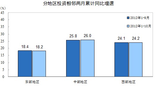 分地區(qū)看,1-10月份,東部地區(qū)投資137801億元,同比增長18.2%,增速比1-9月份回落0.2個百分點;中部地區(qū)投資81645億元,增長26%,提高0.2個百分點;西部地區(qū)投資70439億元,增長24.2%,提高0.1個百分點。