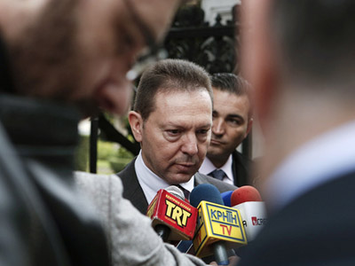 圖為希臘財(cái)政部長(zhǎng)斯圖納拉斯當(dāng)天在一次會(huì)議后接受采訪。