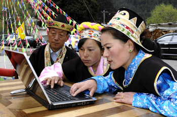 西藏林芝縣唐地村村民通過(guò)互聯(lián)網(wǎng)瀏覽新聞。新華社發(fā)(李偉明/攝) |