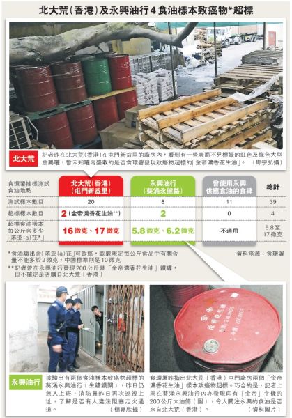 香港食環(huán)署上周到懷疑無牌食品加工場、糧油供貨商和13間食肆抽取39個(gè)樣本化驗(yàn),其中兩個(gè)來自屯門“北大荒”糧油供貨商的兩個(gè)“金帝濃香花生油”樣本,分別驗(yàn)出含每公斤16和17微克“苯并(a)芘”,較國家標(biāo)準(zhǔn)每公斤10微克,多出6至7成;而現(xiàn)時(shí)歐盟標(biāo)準(zhǔn)為每公斤2微克,其樣本亦超出7至7.5倍。
