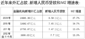 2009年以來(lái),隨著外匯占款的高增長(zhǎng)以及較高的信貸投放規(guī)模,廣義貨幣供應(yīng)量M2也保持了較高的增長(zhǎng)。數(shù)據(jù)顯示,2009年至2011年,金融機(jī)構(gòu)年度外匯占款增長(zhǎng)24681.36億元、32682.67億元和27791.87億元,年度新增人民幣貸款9.59萬(wàn)億元、7.95萬(wàn)億元和7.47萬(wàn)億元。期間,M2增速分別為27.7%、19.7%和13.6%。而且,由于外匯儲(chǔ)備的持續(xù)高增長(zhǎng),為了減少貨幣供應(yīng)量膨脹的壓力,央行不得不數(shù)次連續(xù)提高法定存款準(zhǔn)備金率,以對(duì)沖外匯占款的膨脹。