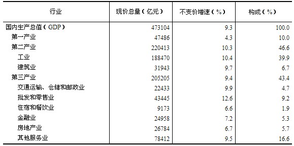 2011年GDP現(xiàn)價(jià)總量為473104億元,比初步核實(shí)數(shù)增加了222億元,按不變價(jià)格計(jì)算,比上年增長(zhǎng)9.3%,與初步核實(shí)數(shù)相同(詳見下表)。