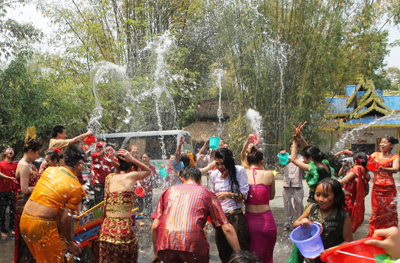 潑水節(jié)有浴佛、過(guò)年、祈雨、迎春耕、祝愿六畜興旺和五谷豐登之意。節(jié)期固定為陽(yáng)歷4月12日至14日。節(jié)期內(nèi)人們互相潑水祝福,唱歌跳舞,放孔明燈等。傣族、德昂族及阿昌族認(rèn)為,潑水可消災(zāi)祛病,吉祥如意。