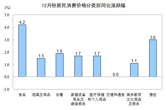 12月份,食品價格同比上漲4.2%,影響居民消費價格總水平同比上漲約1.37個百分點。其中,鮮菜價格上漲14.8%,影響居民消費價格總水平上漲約0.41個百分點;水產(chǎn)品價格上漲6.1%,影響居民消費價格總水平上漲約0.15個百分點;糧食價格上漲4.1%,影響居民消費價格總水平上漲約0.12個百分點;肉禽及其制品價格上漲1.4%,影響居民消費價格總水平上漲約0.11個百分點(豬肉價格下降6.2%,影響居民消費價格總水平下降約0.22個百分點);油脂價格上漲4.5%,影響居民消費價格總水平上漲約0.06個百分點;鮮果價格下降5.6%,影響居民消費價格總水平下降約0.11個百分點。