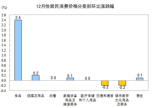 12月份,全國居民消費價格總水平環(huán)比上漲0.8%。其中,城市上漲0.8%,農(nóng)村上漲0.9%;食品價格上漲2.4%,非食品價格持平(漲跌幅度為0);消費品價格上漲1.1%,服務(wù)項目價格持平。