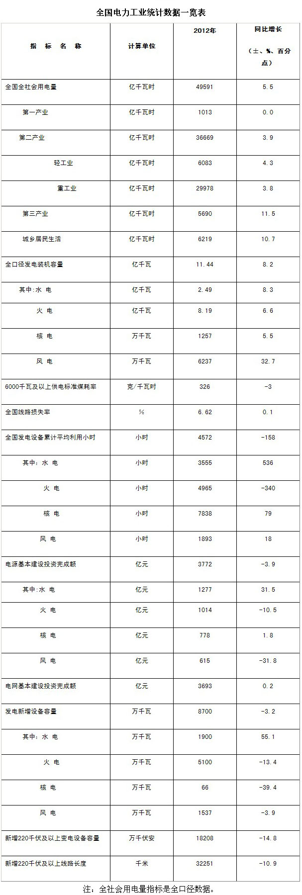 全年發(fā)電新增設(shè)備容量8700萬千瓦,其中,水電1900萬千瓦,火電5100萬千瓦,風(fēng)電1537萬千瓦。截至2012年底,全口徑發(fā)電裝機(jī)容量11.44億千瓦,其中,水電2.49億千瓦,火電8.19億千瓦,核電1257萬千瓦,風(fēng)電6237萬千瓦。